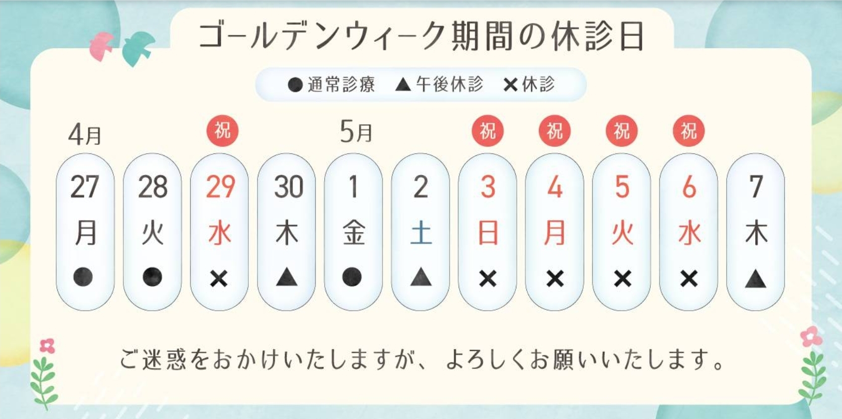 ゴールデンウィーク期間の休診日のお知らせ
